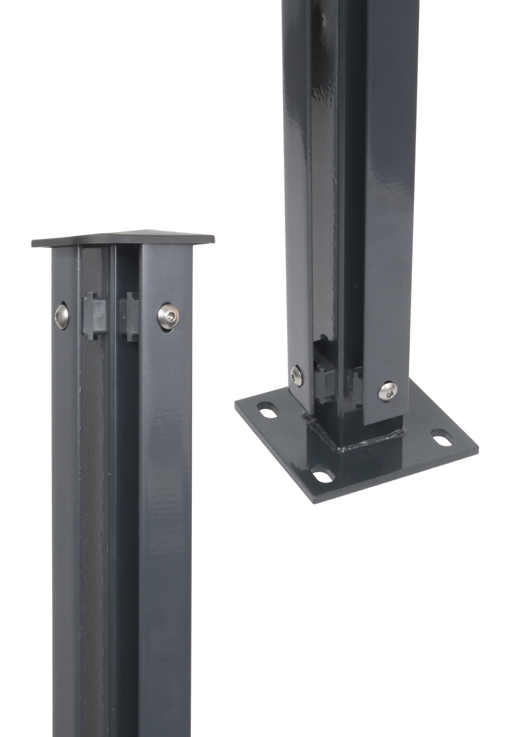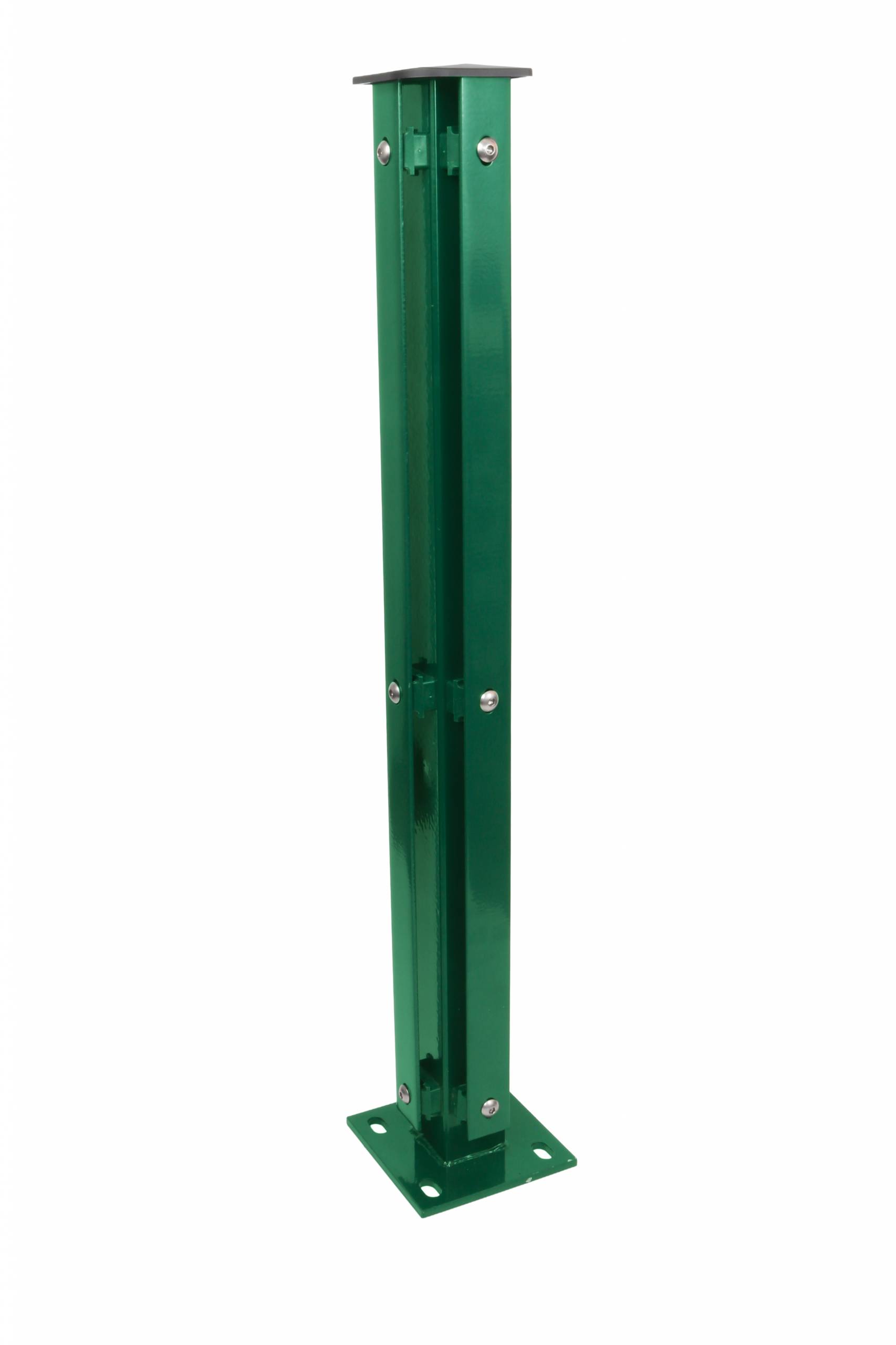 Eck-Zaunpfosten 60×60 mm mit angeschweißter Bodenplatte und Abdeckleiste. Für Ecken beim Aufdübeln.
