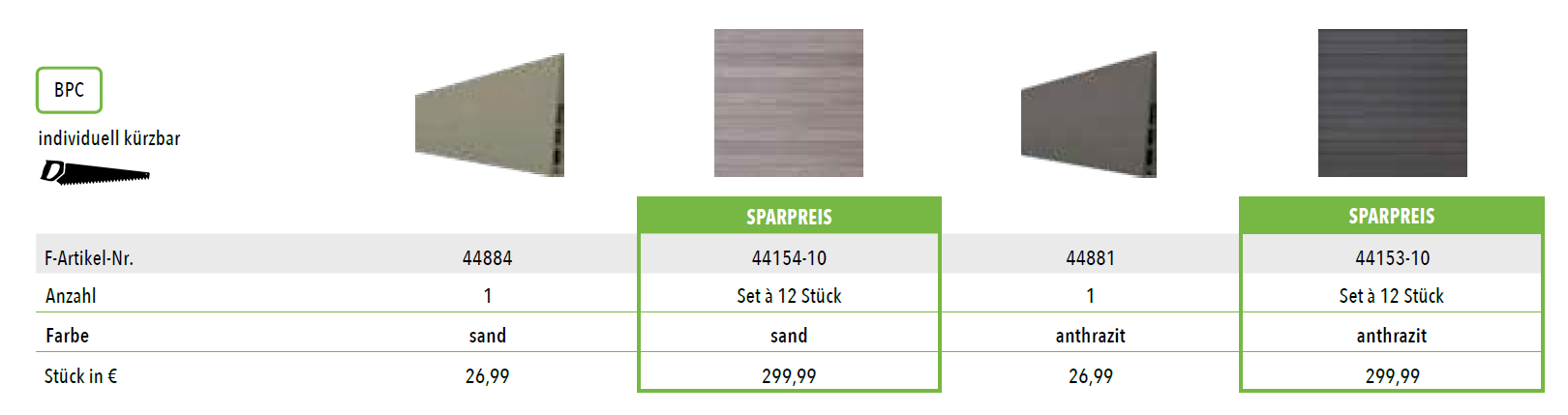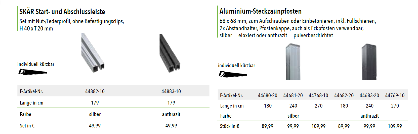 StartseiteZäune / SichtschutzBPC-Steckzaunsystem SKÄR BPC-Steckzaunsystem SKÄRab 166.97€ Authentischer Schwedenprofil-Look: BPC-Lamellen, Schwedenprofil, Zaunset bestehend aus: 12 Zaunlamellen L 1796 x H 148 x T 20 mm, inkl. Clips, ohne Start-/ Abschlussleisten und Pfosten. Set: 175 x 178 cm - BPCSand anthrazit 1 Stk (+€26.99)Set à 12 Stk (+€299.99)1 Stk (+€26.99)Set à 12 Stk (+€299.99)- SKÄR Start- und Abschlussleistesilber (179cm Länge) (+€49.99)anthrazit (179cm Länge) (+€49.99)Set mit Nut-/Federprofil, ohne Befestigungsclips, H 40 x T 20 mm- Aluminium-Steckzaunpfostensilber anthrazit 68 x 68 mm, zum Aufschrauben oder Einbetonieren, inkl. Füllschienen, 2x Abstandhalter, Pfostenkappe, auch als Eckpfosten verwendbar, silber = eloxiert oder anthrazit = pulverbeschichtetLänge in cm180 (+€89.99)240 (+€99.99)270 (+€109.99) Produkt Gesamtpreis Optionen Gesamtpreis Gesamtpreis BPC-Steckzaunsystem SKÄR Menge Jetzt kaufen Add to WishlistRemove from Wishlist Add to Wishlist Kategorie: Zäune / Sichtschutz Produkt-ID: 38772 Beschreibung Beschreibung Ähnliche Produkte Add to WishlistRemove from Wishlist Add to Wishlist MAX WPC-Steckzaunsystem ab 157.97€ Jetzt kaufen Add to WishlistRemove from Wishlist Add to Wishlist TOR KOMPLETTSETS für Steckzaunserien ab 539.98€ Jetzt kaufen Add to WishlistRemove from Wishlist Add to Wishlist WPC-Steckzaunsystem WOLLBACH ab 144.7€ Jetzt kaufen
