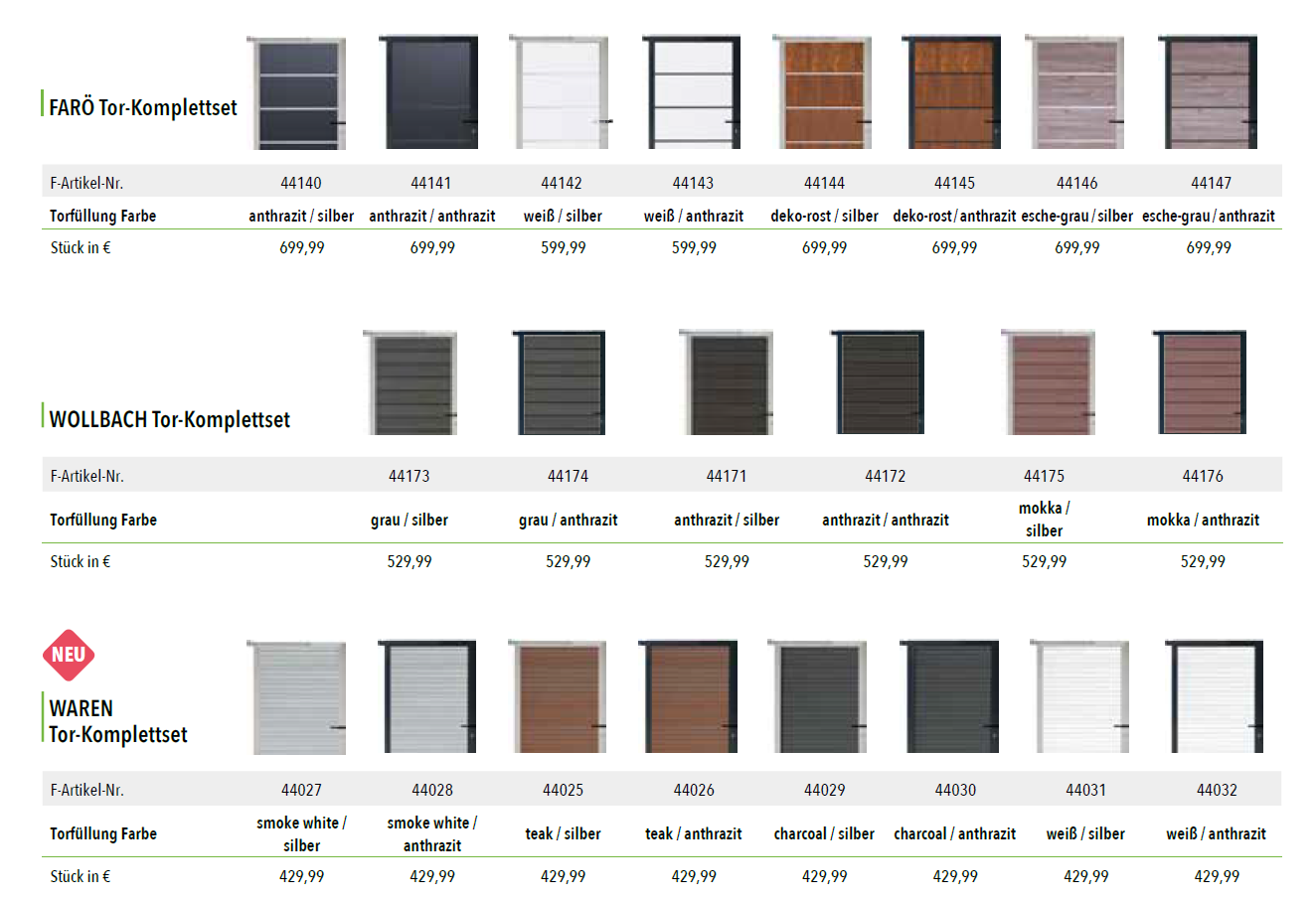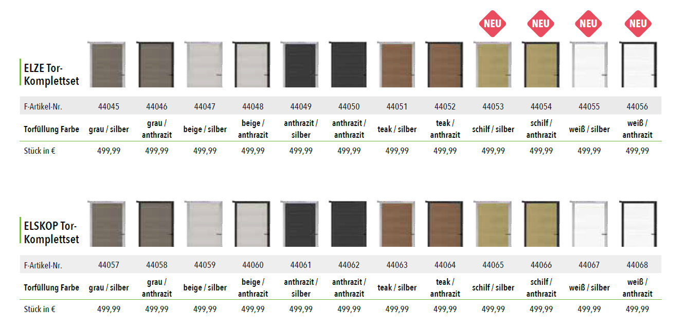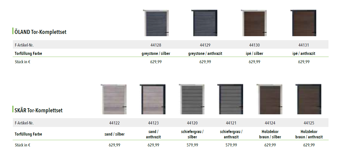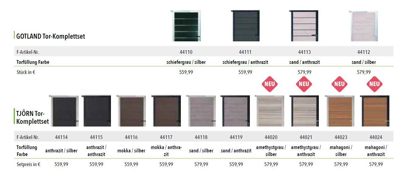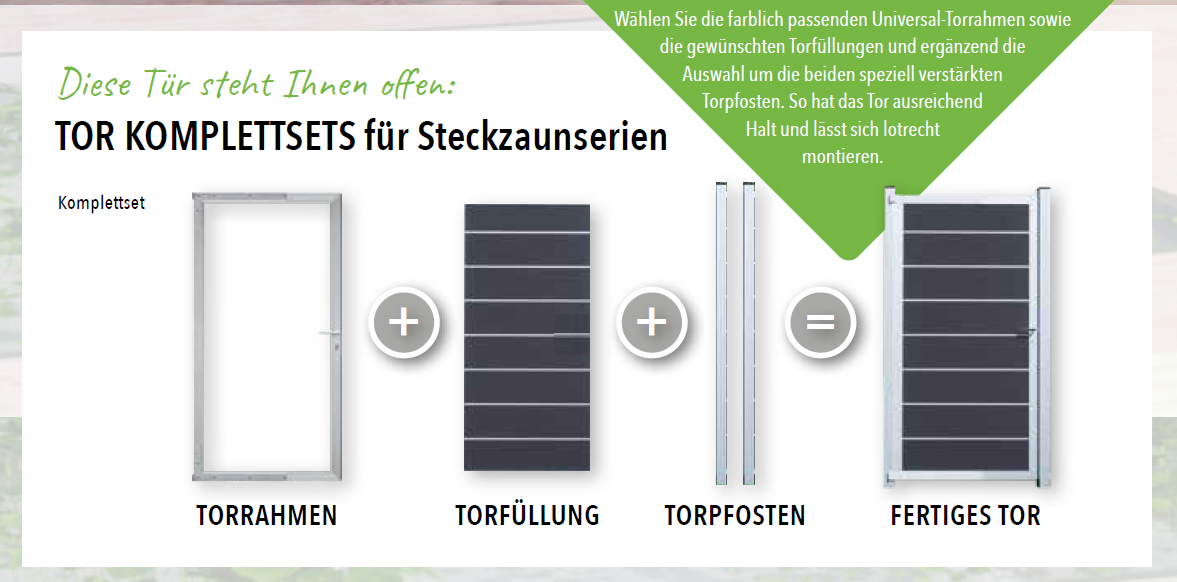 StartseiteZäune / SichtschutzTOR KOMPLETTSETS für Steckzaunserien TOR KOMPLETTSETS für Steckzaunserienab 539.98€ Diese Tür steht Ihnen offen: Bausatz, ca. 90 x 173 cm, inkl. Torrahmen, Beschlägen und Drücker, ohne Pfosten; bei freistehender Montage ist der verstärkte Torpfosten (S. 61) zu wählen - TORPFOSTEN aus Aluminiumsilber (240cm Länge) (+€139.99)anthrazit (240cm Länge) (+€139.99)für alle Steckzaunserien, 6,8 x 6,8 cm, inkl. Stahl U-Profil zur Verstärkung Auch für starke Windlasten empfohlen.- FARÖ Tor-Komplettset ( siehe Beschreibung der Bilder )44140 ( anthrazit / silber ) (+€699.99)44141 ( anthrazit / silber ) (+€699.99)44142 ( weiß / silber ) (+€599.99)44143 ( weiß / anthrazit ) (+€599.99)44144 ( deko-rost / silber ) (+€699.99)44145 ( deko-rost / anthrazit ) (+€699.99)44146 ( esche-grau / silber ) (+€699.99)44147 ( esche-grau / anthrazit ) (+€699.99)- WOLLBACH Tor-Komplettset ( siehe Beschreibung der Bilder ) 44173 ( grau / silber ) (+€529.99)44174 ( grau / anthrazit) (+€529.99)44171 ( anthrazit / silber ) (+€529.99)44172 ( anthrazit / anthrazit) (+€529.99)44175 ( mokka / silber) (+€529.99)44176 ( mokka / anthrazit ) (+€529.99)- WAREN Tor-Komplettset ( siehe Beschreibung der Bilder ) 44027 ( smoke white / silber ) (+€429.99)44028 ( smoke white / anthrazit) (+€429.99)44025 ( teak / silber ) (+€429.99)44026 ( teak / anthrazit) (+€429.99)44029 ( charcoal / anthrazit ) (+€429.99)44030 ( charcoal / anthrazit ) (+€429.99)44031 ( weiß / silber ) (+€429.99)44032 ( weiß / anthrazit ) (+€429.99)- MAX Tor-Komplettset ( siehe Beschreibung der Bilder ) 44033 ( teak, silber ) (+€399.99)44034 (teak, anthrazit ) (+€399.99)44037 (charcoal, silber ) (+€399.99)44038 ( charcoal, anthrazit ) (+€399.99)44035 ( smoke white, silber ) (+€399.99)44036 ( smoke white, anthrazit ) (+€399.99)- MAX-XL Tor-Komplettset ( siehe Beschreibung der Bilder ) 44039 ( teak, silber ) (+€399.99)44040 (teak, anthrazit ) (+€399.99)44043 (charcoal, silber ) (+€399.99)44044 ( charcoal, anthrazit ) (+€399.99)44041 ( smoke white, silber ) (+€399.99)44042 ( smoke white, anthrazit ) (+€399.99)- ELZE Tor- Komplettset ( siehe Beschreibung der Bilder )44045 ( grau / silber ) (+€499.99)44046 (grau / anthrazit ) (+€499.99)44047 (beige / silber) (+€499.99)44048 ( beige / anthrazit) (+€499.99)44049 ( anthrazit / silber ) (+€499.99)44050 ( anthrazit / anthrazit ) (+€499.99)44051 (teak / silber ) (+€499.99)44052 ( teak / anthrazit ) (+€499.99)44053 (schilf / silber ) (+€499.99)44054 (schilf / anthrazit ) (+€499.99)44055 (weiß / silber ) (+€499.99)44056 (weiß / anthrazit ) (+€499.99)- ELSKOP Tor- Komplettset ( siehe Beschreibung der Bilder ) 44057 ( grau / silber ) (+€499.99)44058 (grau / anthrazit ) (+€499.99)44059 (beige / silber) (+€499.99)44060 ( beige / anthrazit) (+€499.99)44061 ( anthrazit / silber ) (+€499.99)44062 ( anthrazit / anthrazit ) (+€499.99)44063 (teak / silber ) (+€499.99)44064 ( teak / anthrazit ) (+€499.99)44065 (schilf / silber ) (+€499.99)44066 (schilf / anthrazit ) (+€499.99)44067 (weiß / silber ) (+€499.99)44068 (weiß / anthrazit ) (+€499.99)- GOTLAND Tor-Komplettset ( siehe Beschreibung der Bilder ) 44110 ( schiefergrau / silber ) (+€599.99)44111 (schiefergrau / anthrazit ) (+€599.99)44112 ( sand / silber ) (+€599.99)44113 ( sand / anthrazit ) (+€599.99)- TJÖRN Tor- Komplettset ( siehe Beschreibung der Bilder ) 44114 ( anthrazit / silber) (+€599.99)44115 ( anthrazit / anthrazit ) (+€599.99)44116 ( mokka/ silber) (+€599.99)44117 ( mokka/ anthrazit) (+€599.99)44118 ( sand / silber ) (+€599.99)44119 ( sand/ anthrazit ) (+€599.99)44120 ( amethystgrau / silber) (+€599.99)44121 ( amethystgrau / anthrazit) (+€599.99)44123 ( mahagoni / silber ) (+€599.99)44124 ( mahagoni / anthrazit) (+€599.99)- ÖLAND Tor-Komplettset ( siehe Beschreibung der Bilder ) 44128 ( greystone / silber ) (+€629.99)44129 (greystone / anthrazit ) (+€629.99)44130 (ipé / silber) (+€629.99)44131 ( ipé / anthrazit) (+€629.99)- SKÄR Tor-Komplettset ( siehe Beschreibung der Bilder )44122 ( sand / silber ) (+€629.99)44123 (sand / anthrazit ) (+€629.99)44120 (schiefergrau / silber) (+€629.99)44121 ( schiefergrau / anthrazit) (+€630.99)44124 ( Holzdekor braun / silber ) (+€629.99)44125 ( Holzdekor braun / anthrazit ) (+€629.99) Produkt Gesamtpreis Optionen Gesamtpreis Gesamtpreis TOR KOMPLETTSETS für Steckzaunserien Menge Jetzt kaufen Add to WishlistRemove from Wishlist Add to Wishlist Kategorie: Zäune / Sichtschutz Produkt-ID: 38787 Beschreibung Beschreibung Ähnliche Produkte Add to WishlistRemove from Wishlist Add to Wishlist MAX WPC-Steckzaunsystem ab 157.97€ Jetzt kaufen Add to WishlistRemove from Wishlist Add to Wishlist WPC-Steckzaunsystem WOLLBACH ab 144.7€ Jetzt kaufen Add to WishlistRemove from Wishlist Add to Wishlist BPC-Rhombus-Steckzaunsystem HANÖ ab 429.97€ Jetzt kaufen